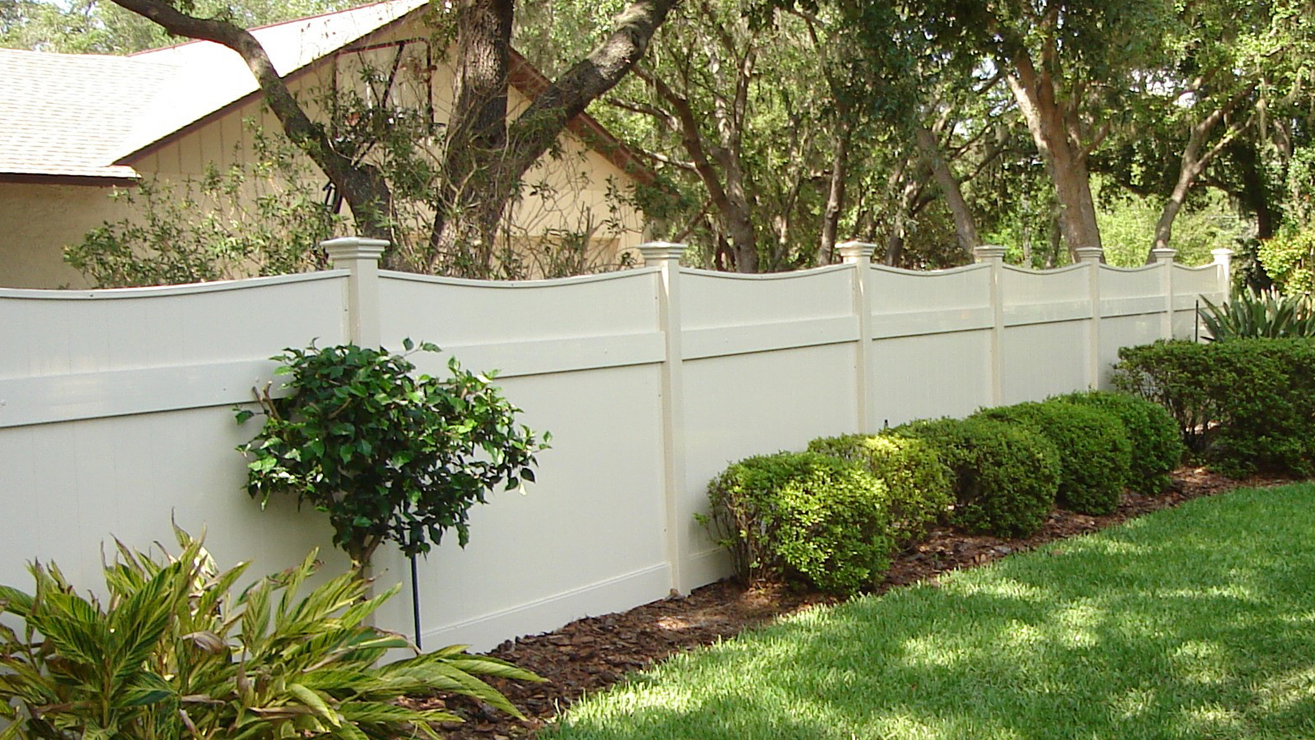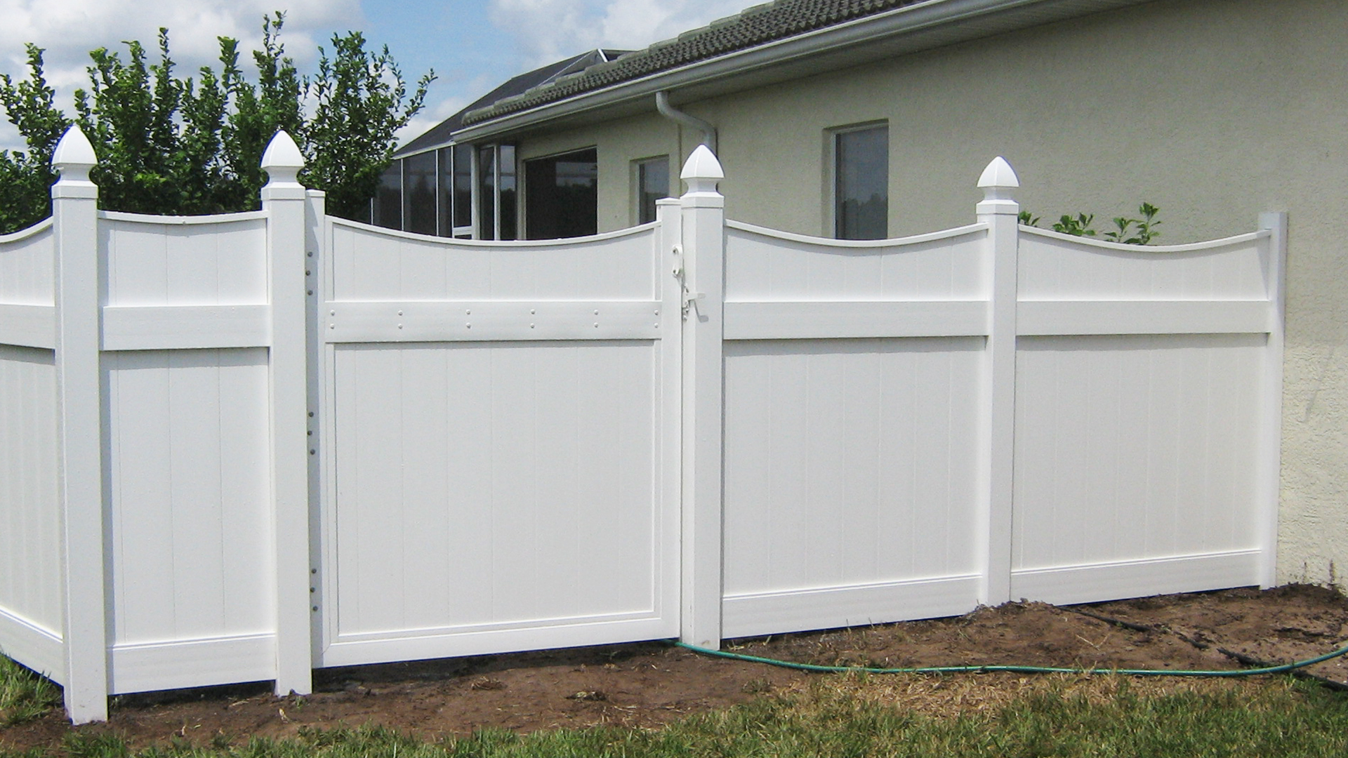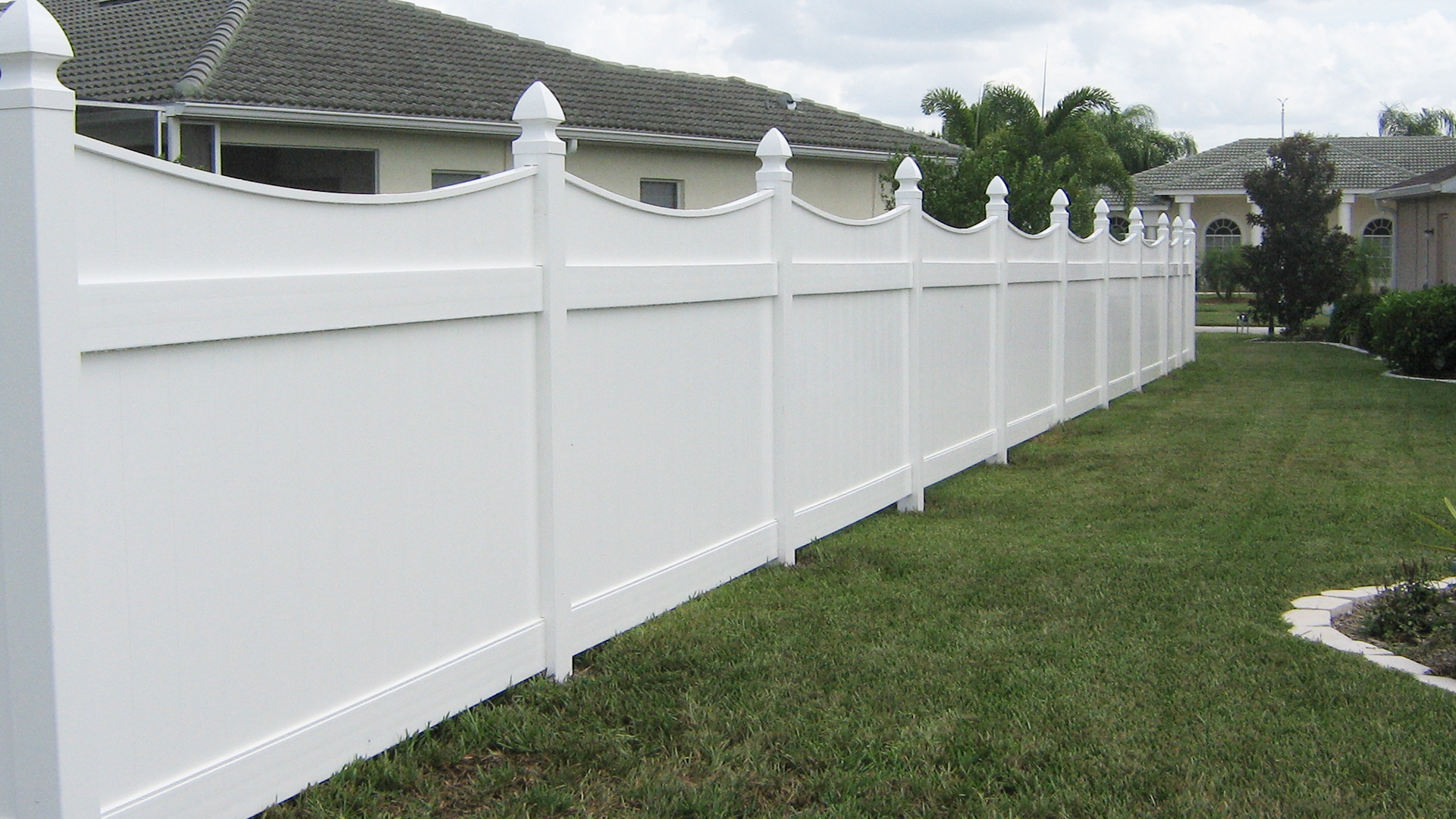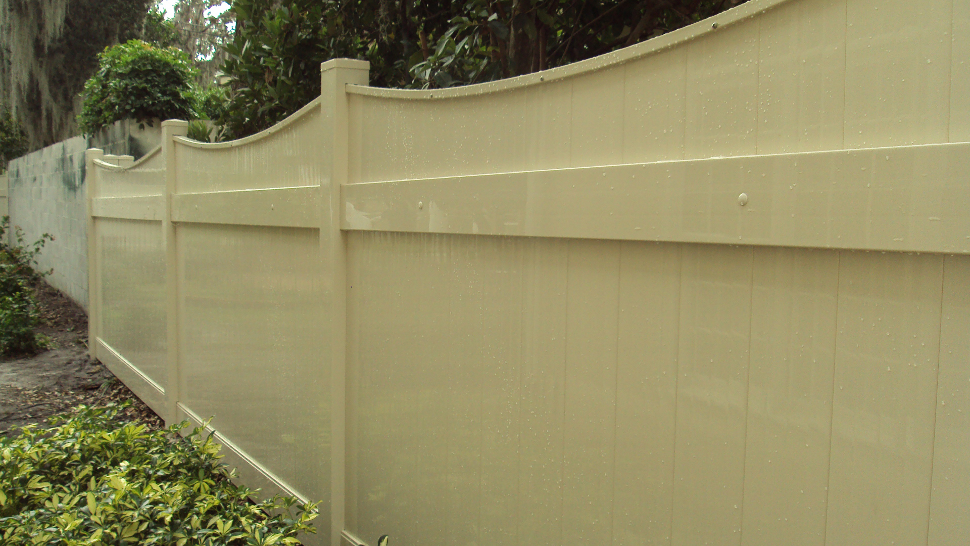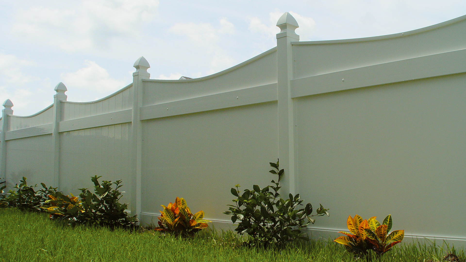 The Lakeland Concave Vinyl Fence is a style option within the Lakeland Fence line. The concave top adds a beautiful custom look. Like the original Lakeland Vinyl Fence, the concave option provides full privacy and can be used for various residential and commercial applications. It is one of the most versatile and easily customized PVC/vinyl fence styles. Whether around a pool, garden, patio, or to enclose a pool pump, there is a style and color as well as a new natural wood grain texture for you.