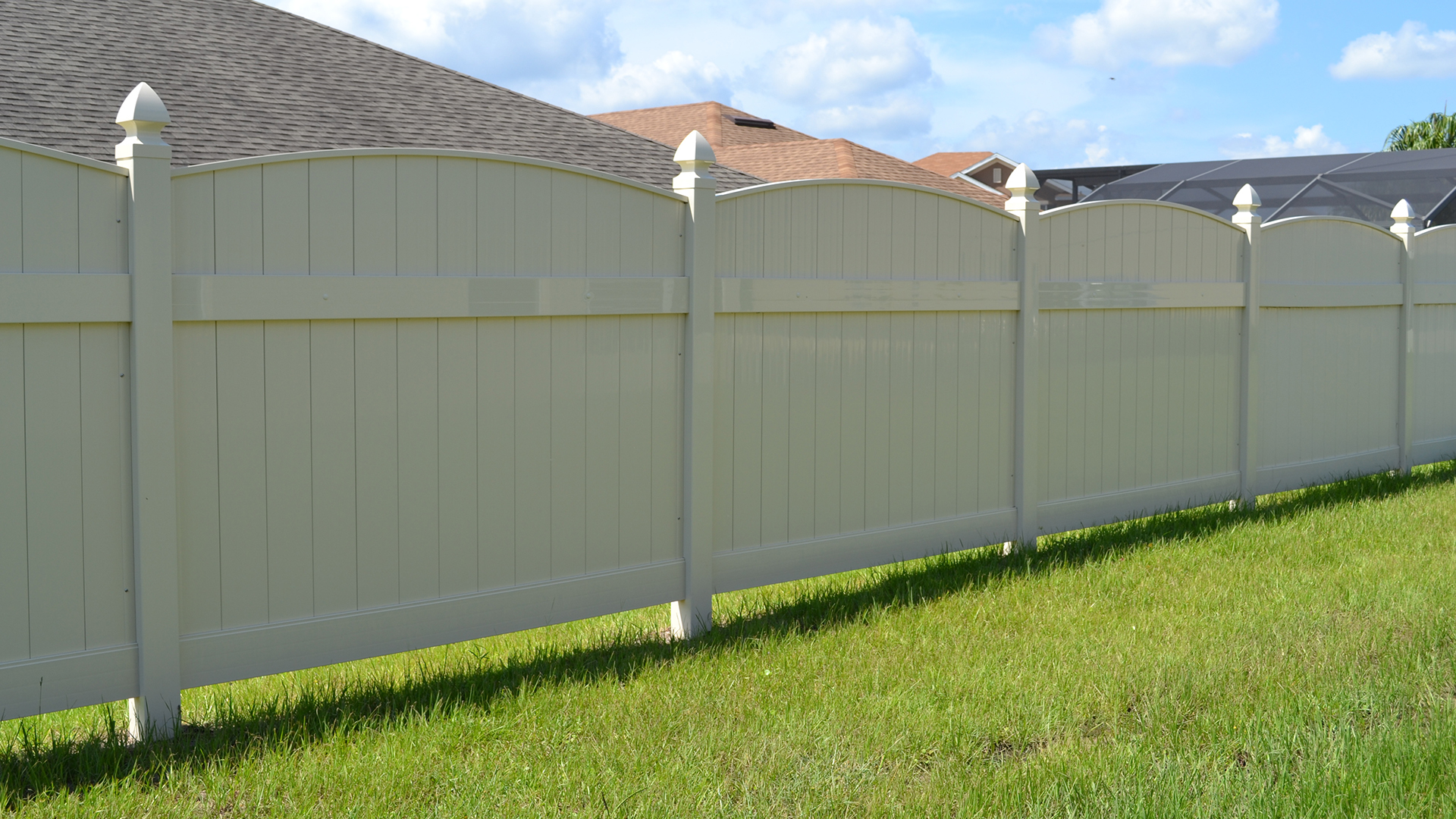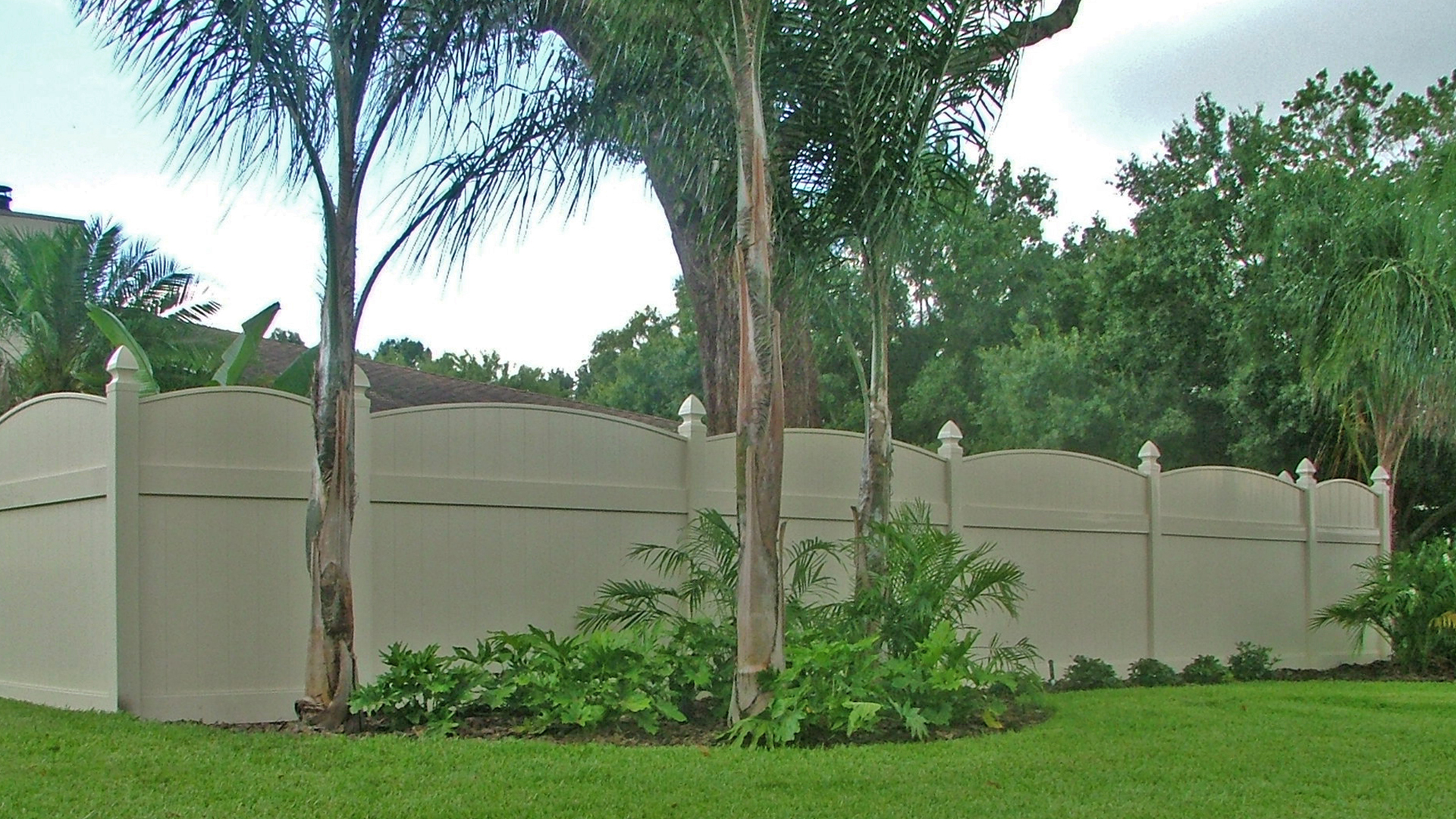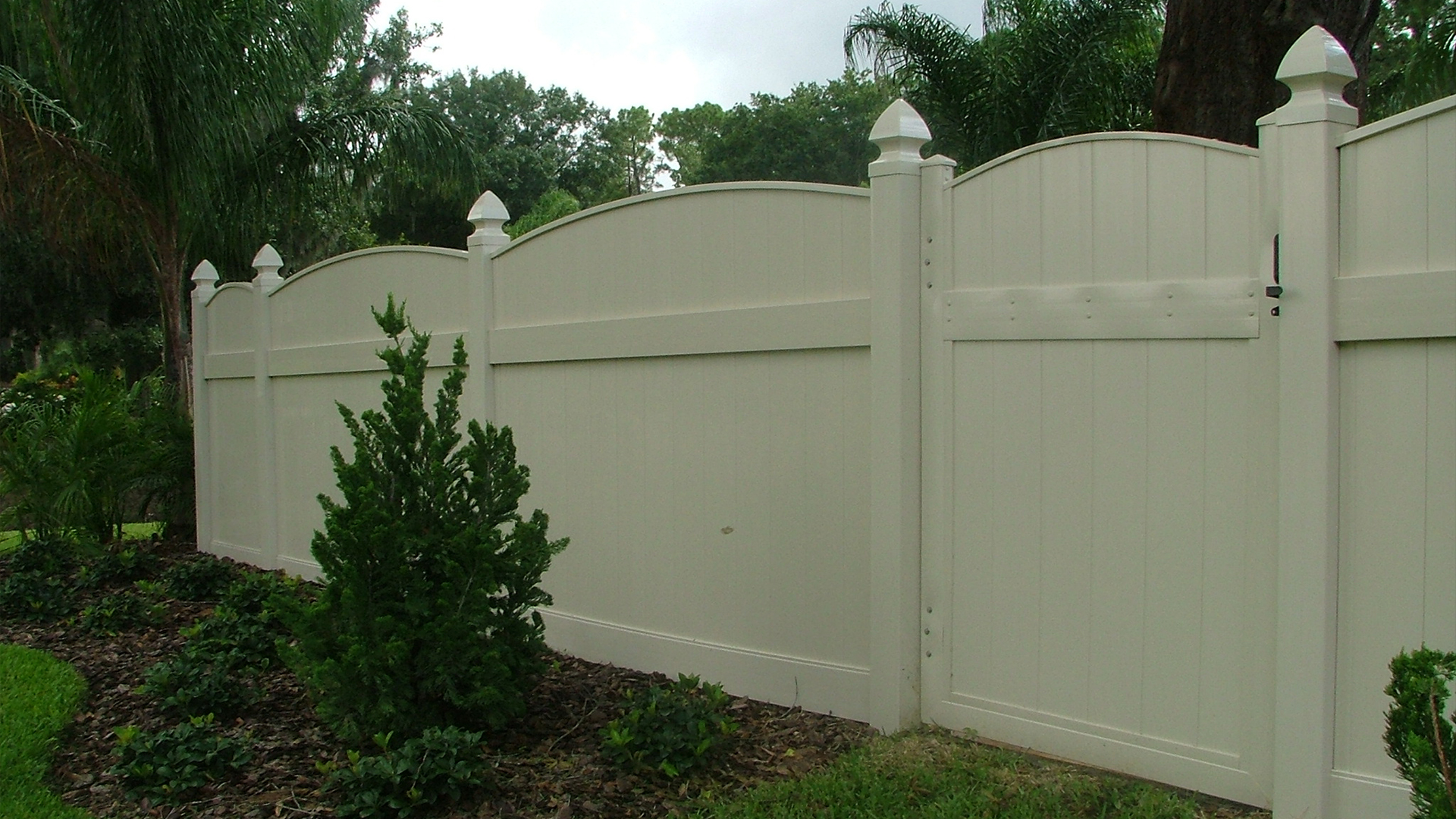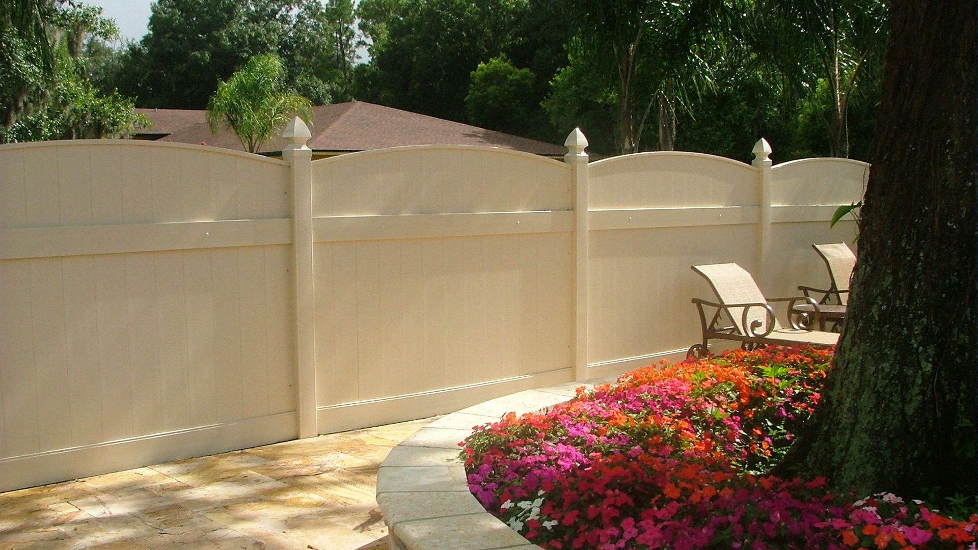 The Lakeland Convex Vinyl Fence is a style option within the Lakeland Fence line. The convex top adds a beautiful custom look. Like the original Lakeland Vinyl Fence, the convex option provides full privacy and can be used for various residential and commercial applications. It is one of the most versatile and easily customized PVC/vinyl fence styles. Whether around a pool, garden, patio, or to enclose a pool pump, there is a style and color as well as a new natural wood grain texture for you.