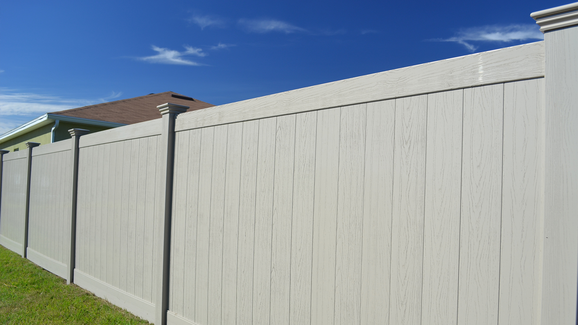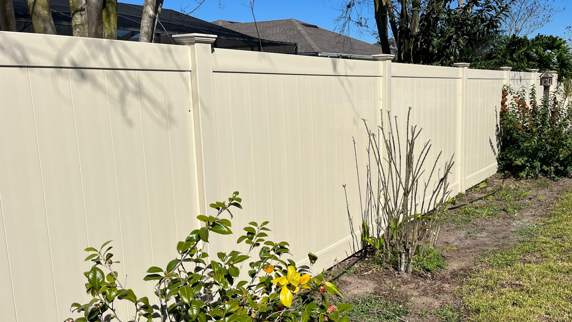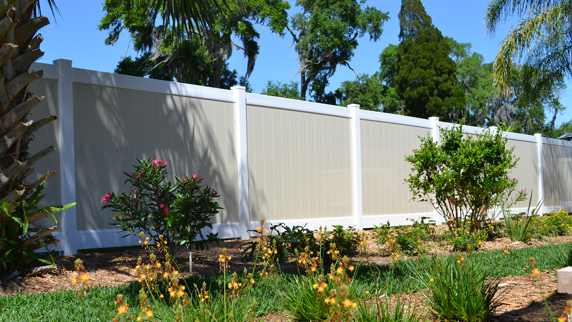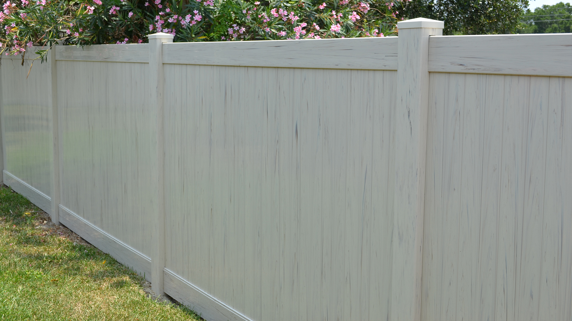 The Lakeland Vinyl Fence is one of Danielle Fence & Outdoor Living's most popular full privacy PVC/vinyl tongue and groove fence styles and can be used for various residential and commercial applications. It is one of the most versatile and easily customized PVC/vinyl fence styles. Whether around a pool, garden, patio, or to enclose a pool pump, there is a style and color as well as a new natural wood grain texture for you. Add a convex or concave top or combine with a PVC/vinyl picket style fence. You can even combine almond posts, post caps and rails with white pickets. The possibilities are endless.
