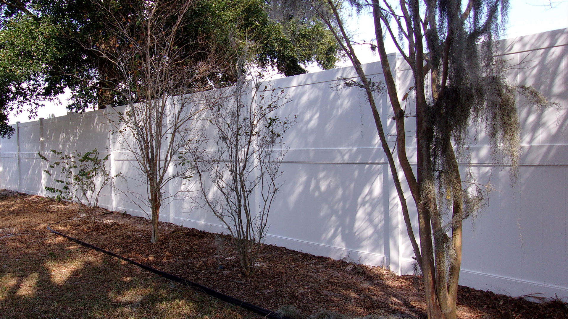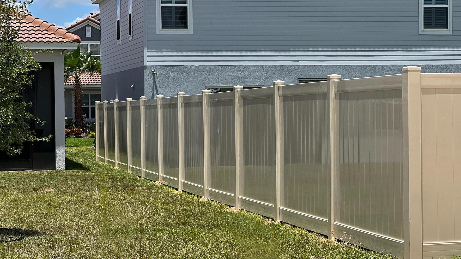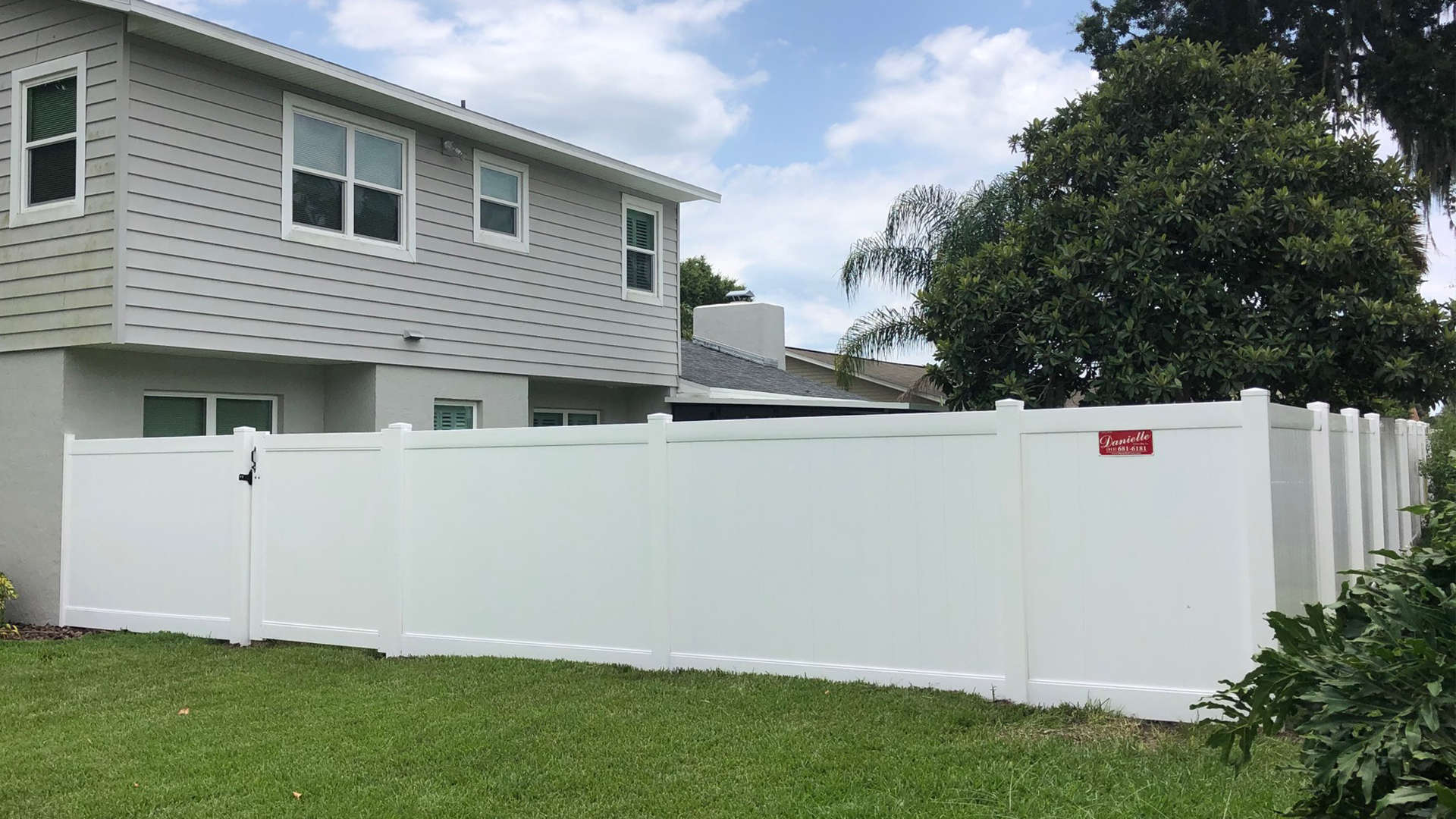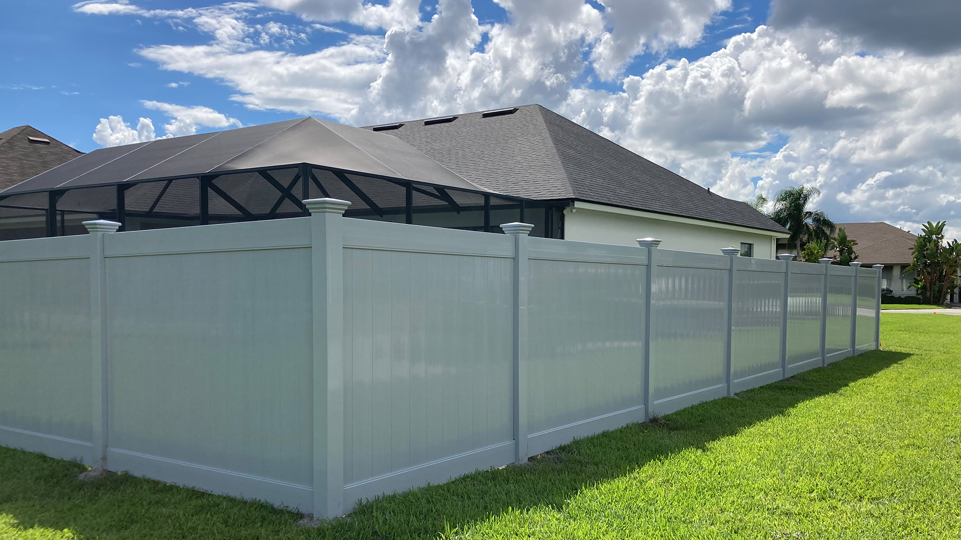 The Lakeland Vinyl Fence is one of Danielle Fence & Outdoor Living's most popular full privacy PVC/vinyl tongue and groove fence styles and can be used for various residential and commercial applications. It is one of the most versatile and easily customized PVC/vinyl fence styles. Whether around a pool, garden, patio, or to enclose a pool pump, there is a style and color as well as a new natural wood grain texture for you. Add a convex or concave top or combine with a PVC/vinyl picket style fence. You can even combine almond posts, post caps and rails with white pickets. The possibilities are endless.